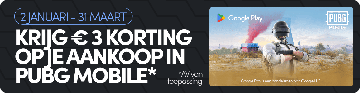 Geldig voor een korting van € 3 op een in-app aankoop in PUBG MOBILE op Google Play met een winkelprijs van minimaal € 15 op het moment van de aankoop. Abonnementen zijn uitgesloten. Beschikbaar voor gebruikers die een Google Play-cadeaukaart ter waarde van minimaal € 15 kopen bij deelnemende verkopers tussen 02/01/2026 en 31/03/2026. Wissel de Google Play-cadeaukaart in op uiterlijk 14/04/2026. Korting verloopt 14 dagen na inwisseling van de Google Play-cadeaukaart. Maximaal 1 per gebruiker. Volledige voorwaarden: g.co/play/giftcards. Google Play is een handelsmerk van Google LLC. © 2026 KRAFTON, Inc. ALL RIGHTS RESERVED. © 2019-2026 Proxima Beta Pte. Limited. ALL RIGHTS RESERVED.
